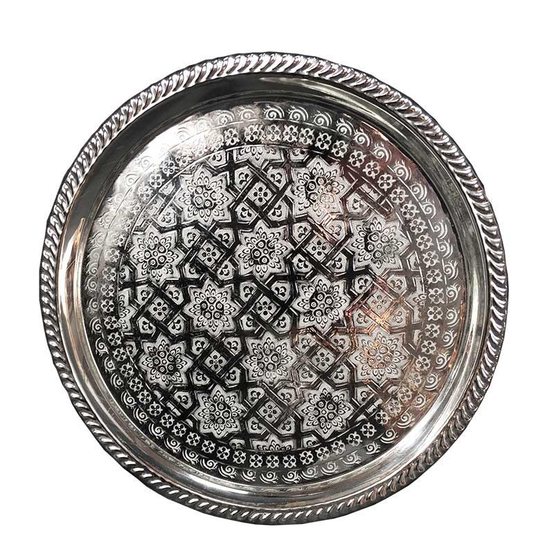 Vassoio tradizionale marocchino in metallo argentato inciso a mano, con raffinati motivi geometrici e floreali. Perfetto per servire il tè o come elegante centrotavola dal fascino orientale.